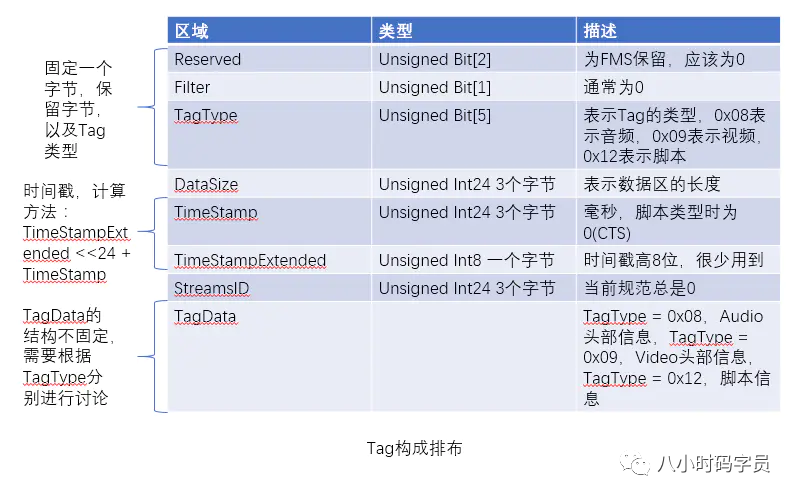 Tag Header 存放了当前Tag的类型,数据长度、时间戳、时间戳扩展、StreamsID等信息,然后再接着数据区Tag Data。Tag的排布如下: