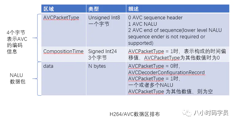 ◆ Video数据区部分不同视频格式会不同。对于H264/AVC编码部分,Video数据区排布如下: