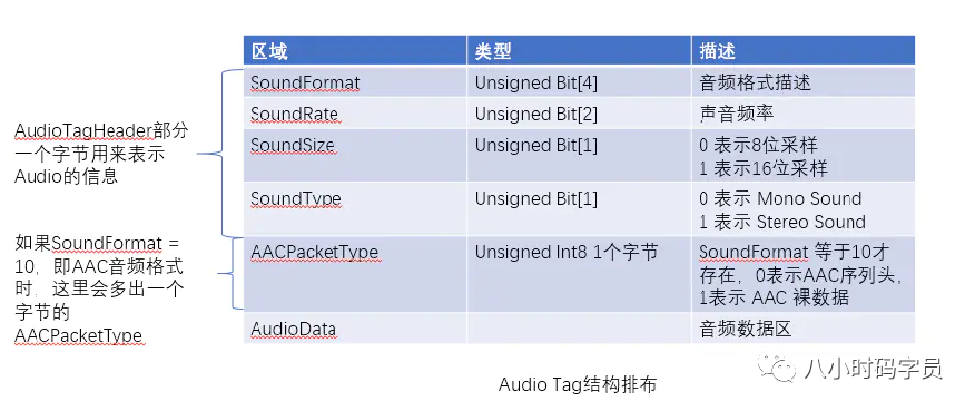 音频的Tag Data又分为 AudioTagHeader 和 Data 数据区,其排布结构如下图所示: