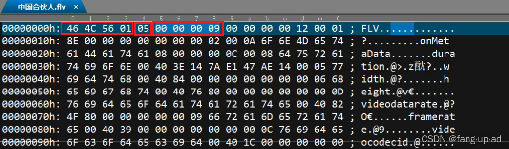 如下为FLV抓包数据,其中前3个字节为固定的,第4个字节为版本号。然后0x05二进制是0101,所以表示此文件有音频有视频。最后4个字节表示9,无扩展头信息。