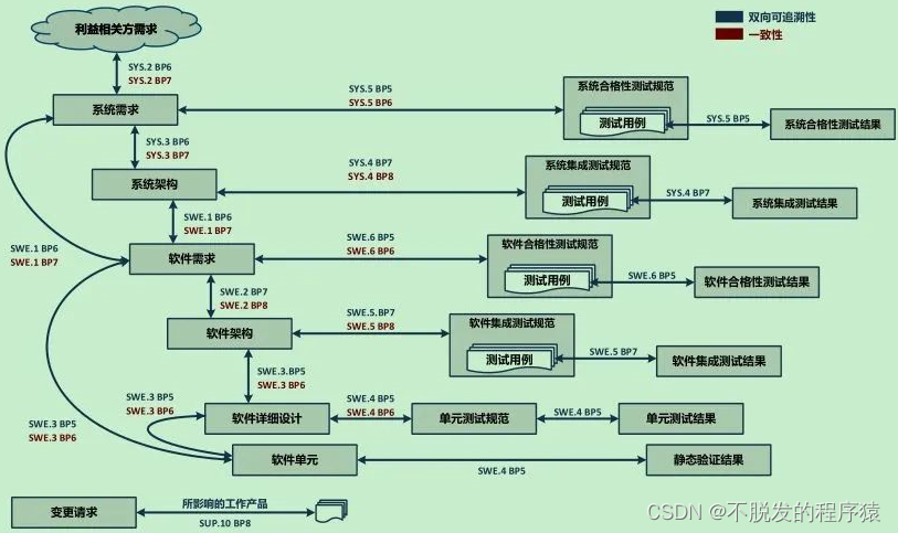 - 建立软件需求与软件单元之间的一致性和双向可追溯性;建立软件架构设计与软件详细设计之间的一致性和双向可追溯性;建立软件详细设计与软件单元之间一致性和双向可追溯性;