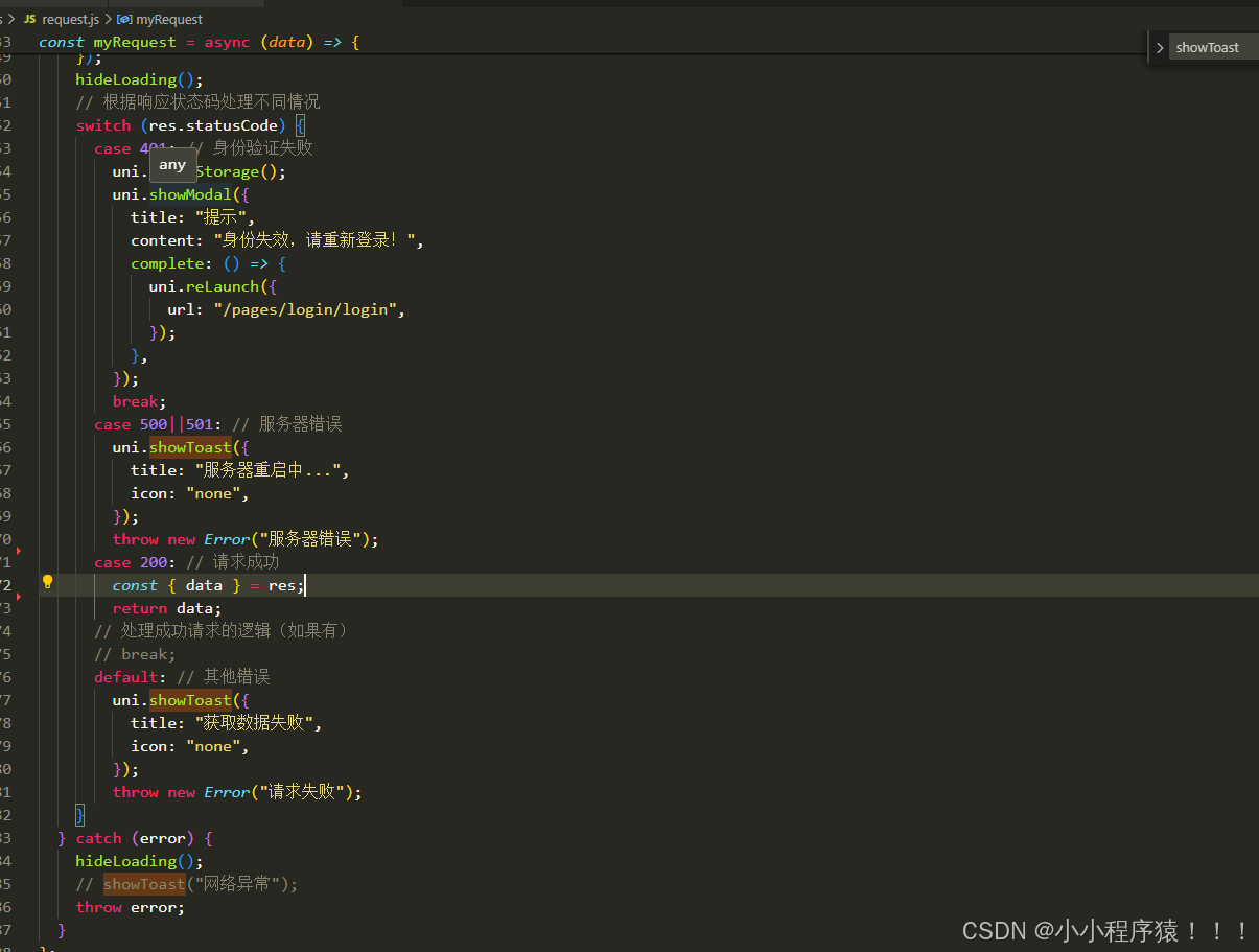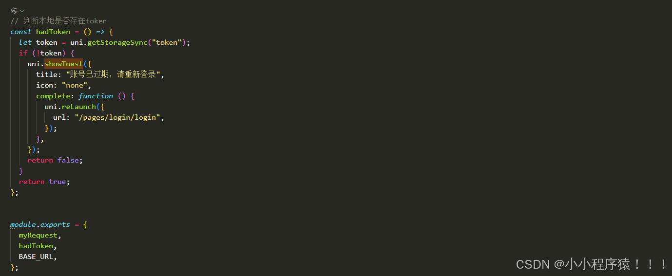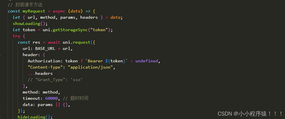 配置url接口地址 BASE_URL。### 封装原始请求request。###判断是否存在token。###根据状态码提示信息。