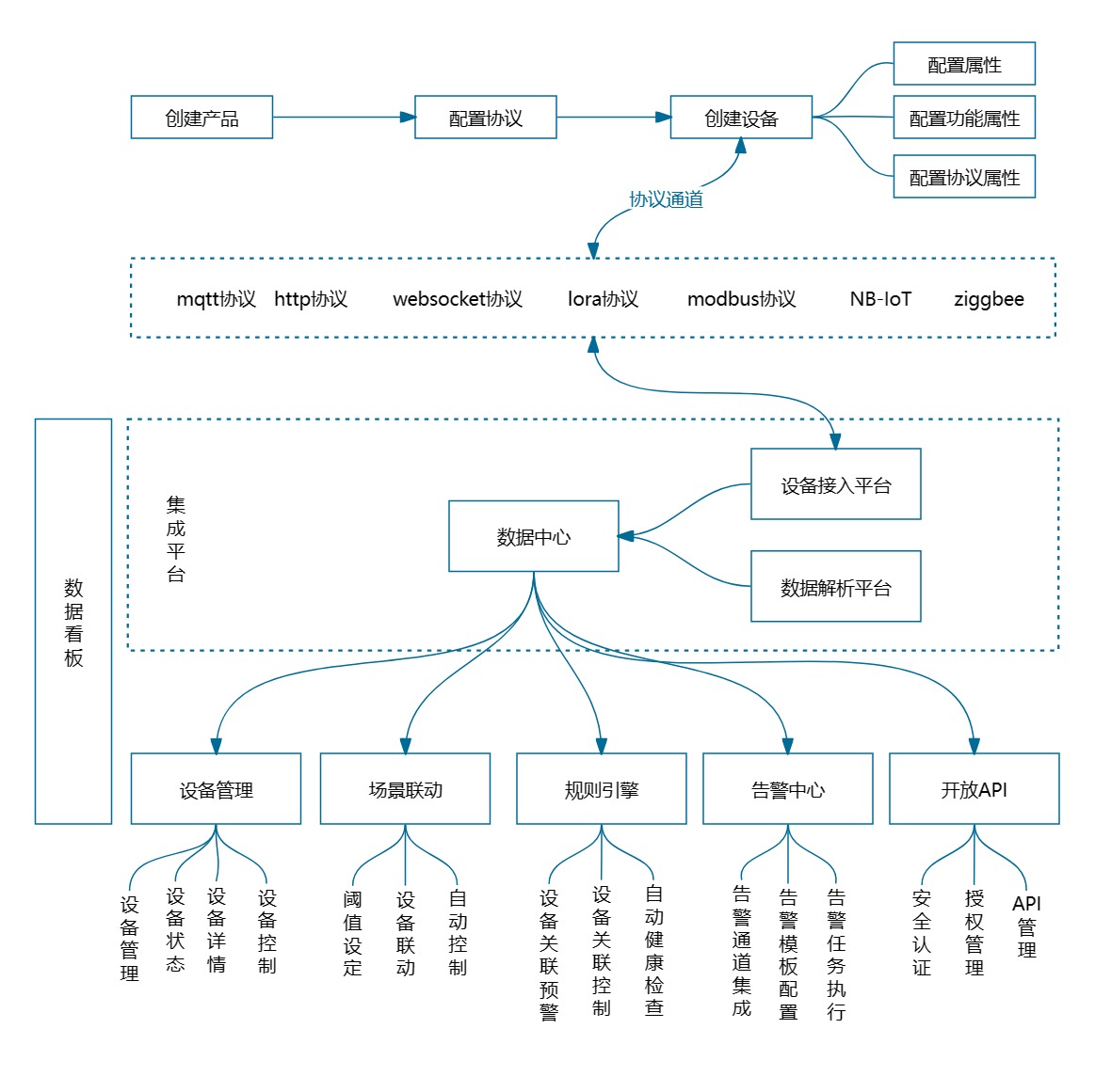 - 系统包含设备管理、场景联动、规则引擎、告警系统等功能模块。这些功能模块相互协作,为您打造一个全方位的物联网管理平台。