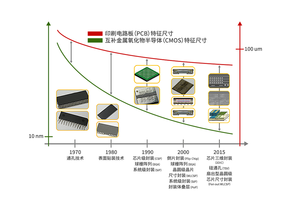 除了上述旨在推进封装技术特定作用的发展趋势,促使封装技术发生演变的另一个驱动力是整个半导体行业的发展。在图5中,红色线条表示自20世纪70年代以来装配过程中安装的印刷电路板(PCB)10的特征尺寸变化情况,绿色线条则表示晶圆上CMOS晶体管的特征尺寸变化情况。缩小特征尺寸有助在印刷电路板和晶圆上绘制更小的图案。