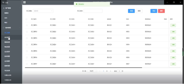 员工信息登记,在员工信息登记页面通过填写员工编号、员工类型、员工姓名、员工性别、身份证、年龄、联系电话、物业、业主等信息并提交,如图5-4所示。