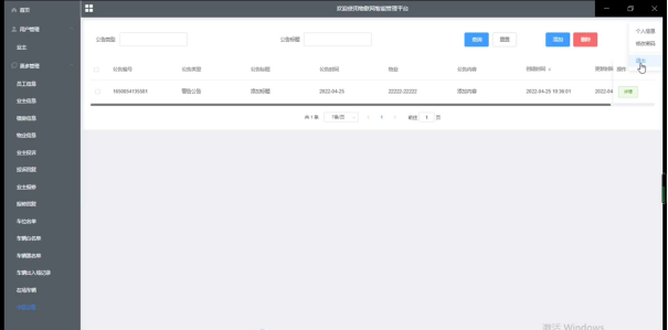 小区公告管理,在小区公告管理页面中可以查看公告编号、公告类型、公告标题、公告时间、物业、公告内容等信息,还可以根据需要进行修改或删除等详细操作如图5-8所示。