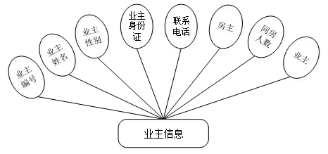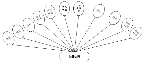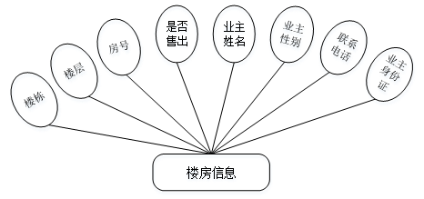 物业信息管理实体属性主要包括楼栋、楼层、房号、业主姓名、业主性别、联系电话、业主身份证、等属性。物业信息管理实体属性图如图4-6所示。
