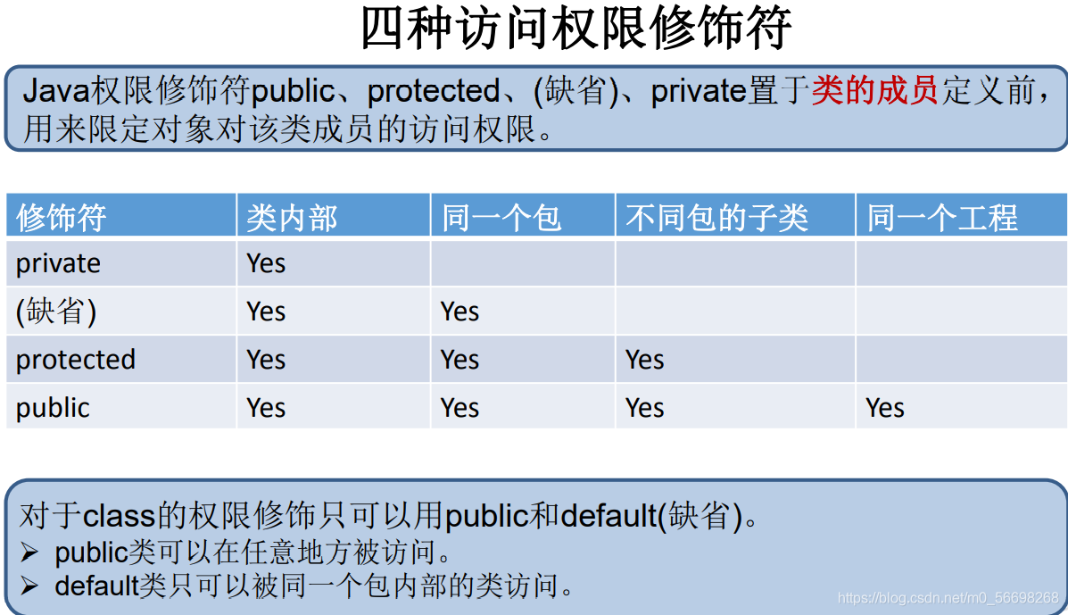 1、java规定的的4种权限 (从小到大排列):private、缺省、protected、public