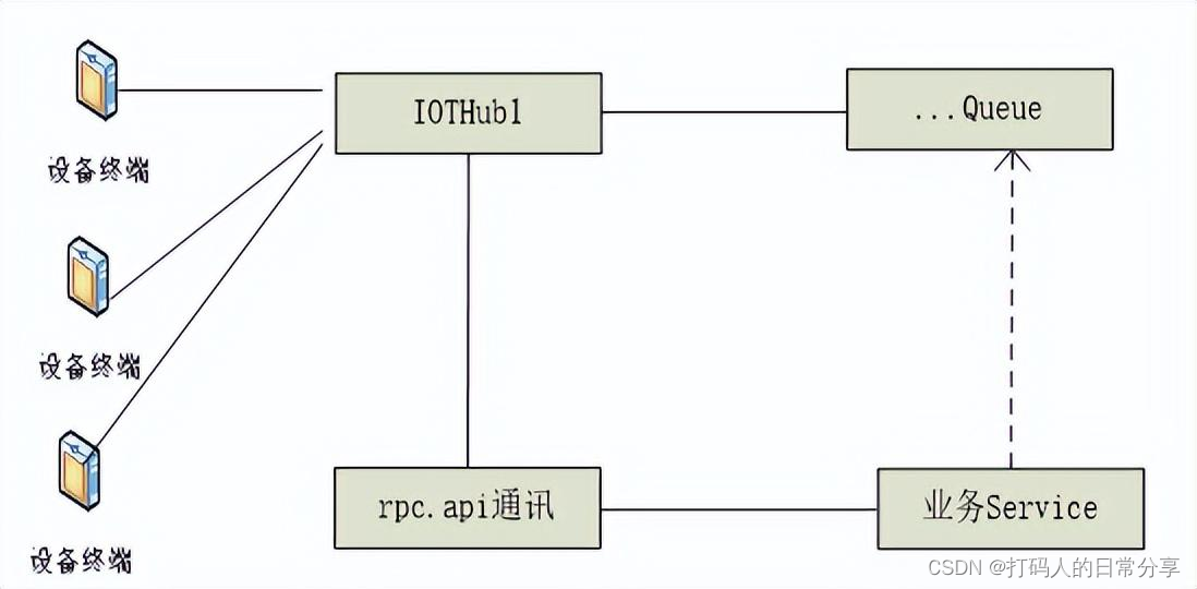 3) 横向设计方案,该设计方案目前azure云,阿里云等为代表的大型互联网公司,采用了该软件架构方式,主要有由通讯组件,队列组件,Rpc.api通讯接口,设备管理平台构成该通讯采集系统。
