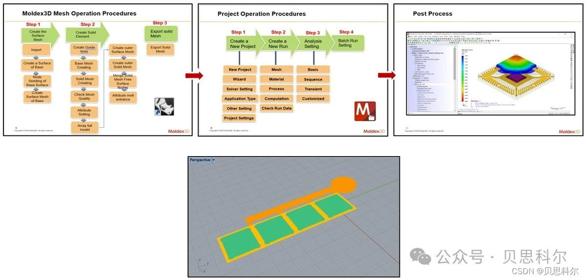 在IC封装制程的制程模拟中,为了同时提升工作效率与质量,CAE团队常会面临到许多挑战。在一般的CAE分析流程中,仿真分析产生结构性网格,是非常繁琐且相当花时间的。必须要先汇入2D (或3D) 图档,接着陆续建立表面网格、高质量的三维实体网格,再检查其网格的质量及正确性,以确保没有网格缺陷;接着再设定不同的属性,如chip, die等等;完成一个单元 (unit) 的实体网格建立后,还需要根据 strip 的设计并透过复制实体网格等方式建立一个完整封装模型,并且在模型外进行流道等实体网格的建立及边界条件设定等,才算是完成一个封装制程分析的网格处理。而待网格处理完成后还需建立项目,其建立步骤为:先创建一个新专案;接着建立分析流程,包含设定网格、材料、成型条件等等;再来就是分析顺序的设定,这些都完成后才开始进行分析,待分析结束后才能检视其分析结果。