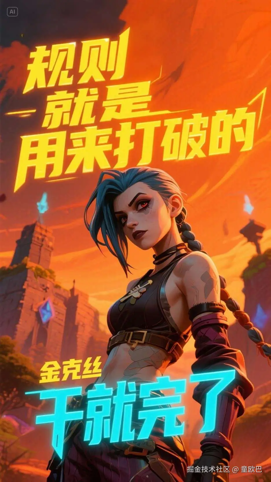 提示词:英雄联盟游戏更新海报,新英雄金克丝,背景是召唤师峡谷,标题为"规则就是用来打破的",副标题为"干就完了",标题3D发光质感