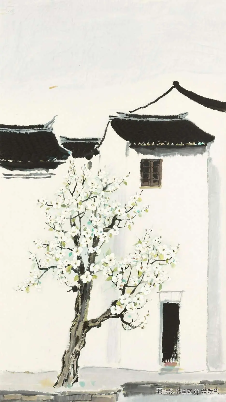 提示词:苏州,白墙黑瓦,一棵开满白色花的老梨树,意境优美,极简构图,远景,景深,吴冠中油画