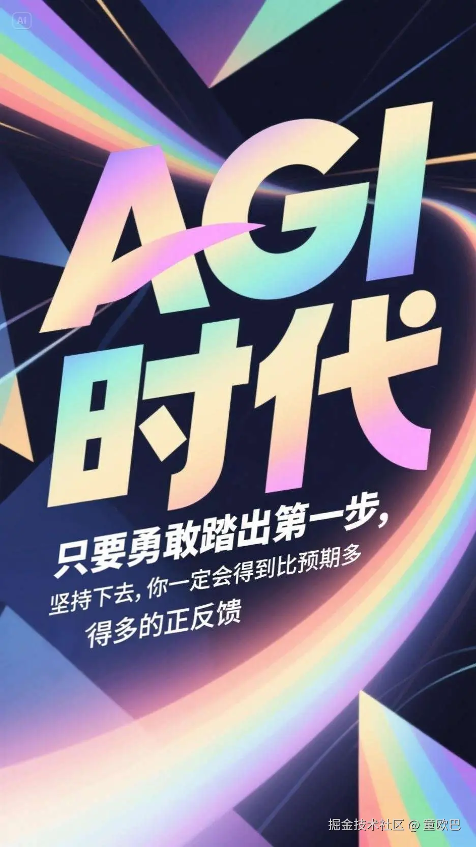 设计一张海报,创意艺术字,内容"AGI时代,只要勇敢踏出第一步,坚持下去,你一定会得到比预期多得多的正反馈"