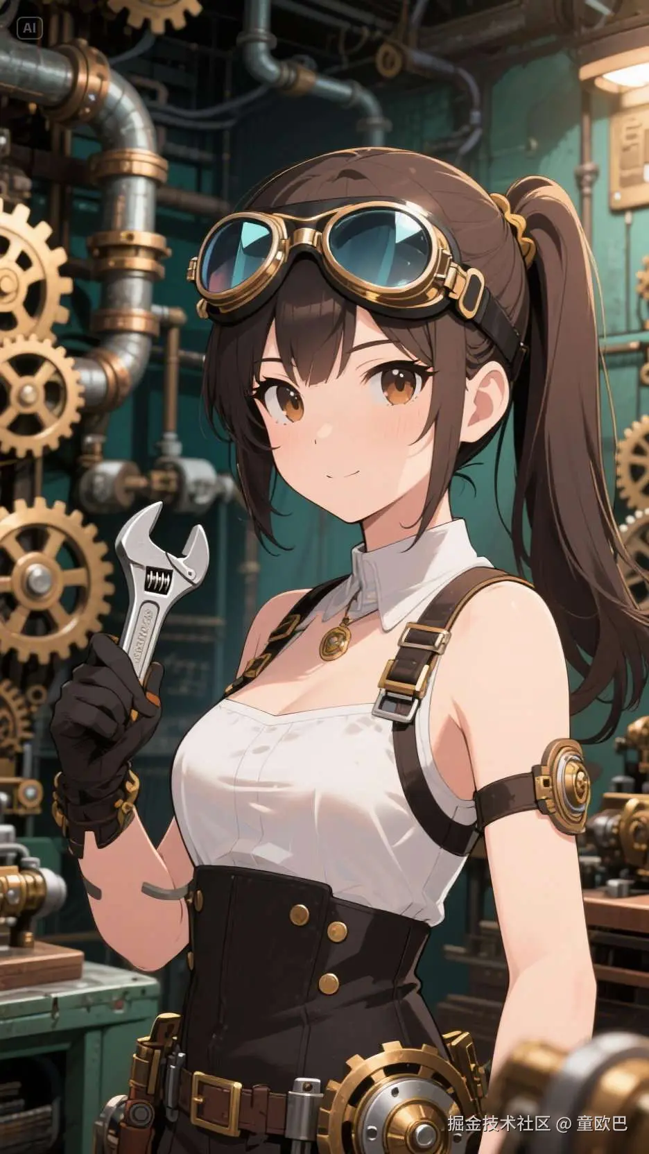 提示词:动漫风格,机械工程师少女,人脸特写镜头,近景,戴着护目镜,手持扳手,站在充满蒸汽朋克风格机器的工作室中,背景有复杂的齿轮和管道,头发束成马尾,表情专注而自信