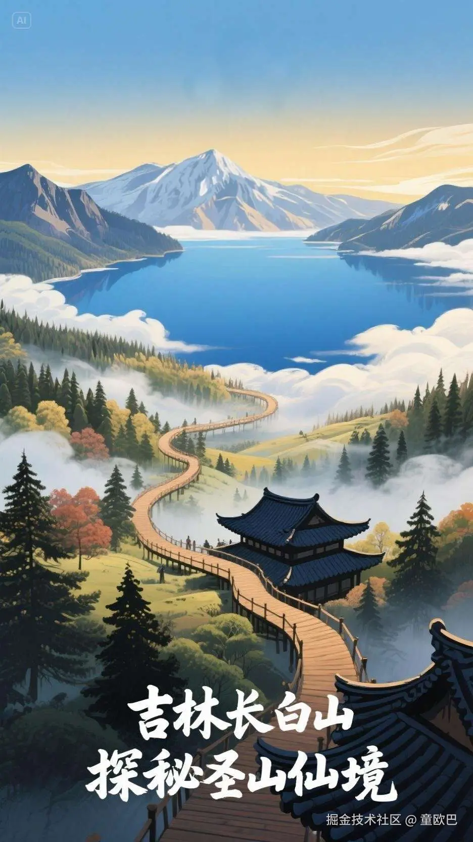 提示词:长白山天池全景作为视觉中心,针叶林环绕的蜿蜒木栈道,朝鲜族传统建筑屋檐剪影点缀,国风插画风格,广角俯视构图,晨雾与云海交织,蓝金渐变色调,"吉林长白山,探秘圣山仙境"书法标题置于留白处,丝绸质感,水墨渲染,四季景色层次叠加