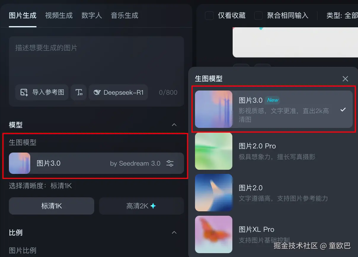 点击生图模型这里,在弹出的面板中选择第一个图片 3.0 模型。