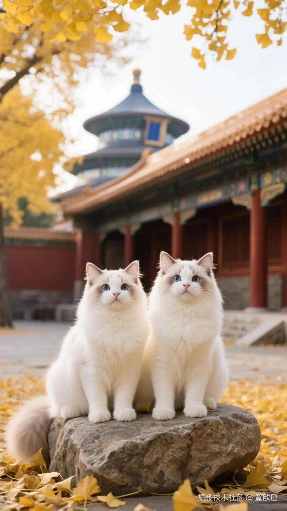 提示词:两只白色的可爱布偶猫,并肩坐在天坛的一块石头上,背景是微微泛黄的银杏叶和廊庭