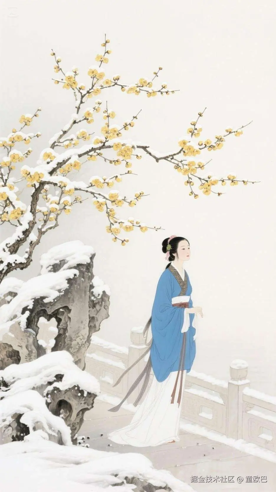 提示词:工笔画,金色腊梅花盛开,雪压花枝,花香袭人,旁边一位穿蓝色汉服美女散步,背景里有假山和护栏,留白,构图精美