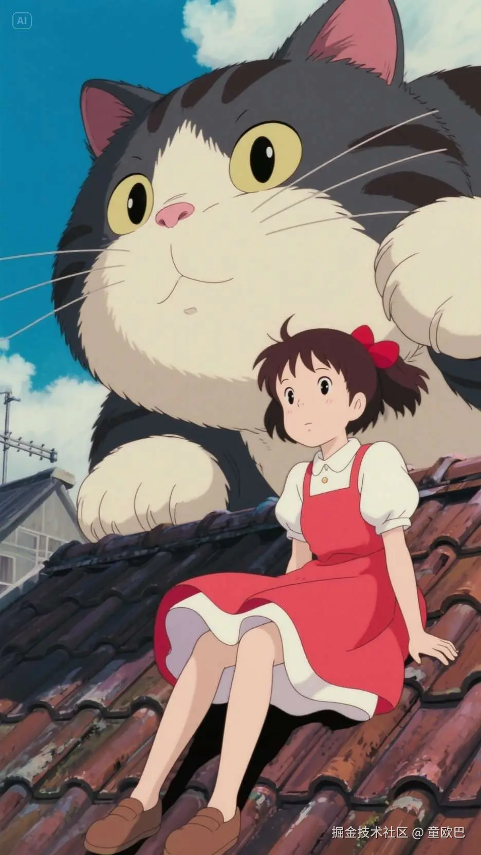 提示词:一个可爱的动漫女孩,红白色连衣裙;坐在屋顶上,旁边一直巨型大猫,宫崎骏风格