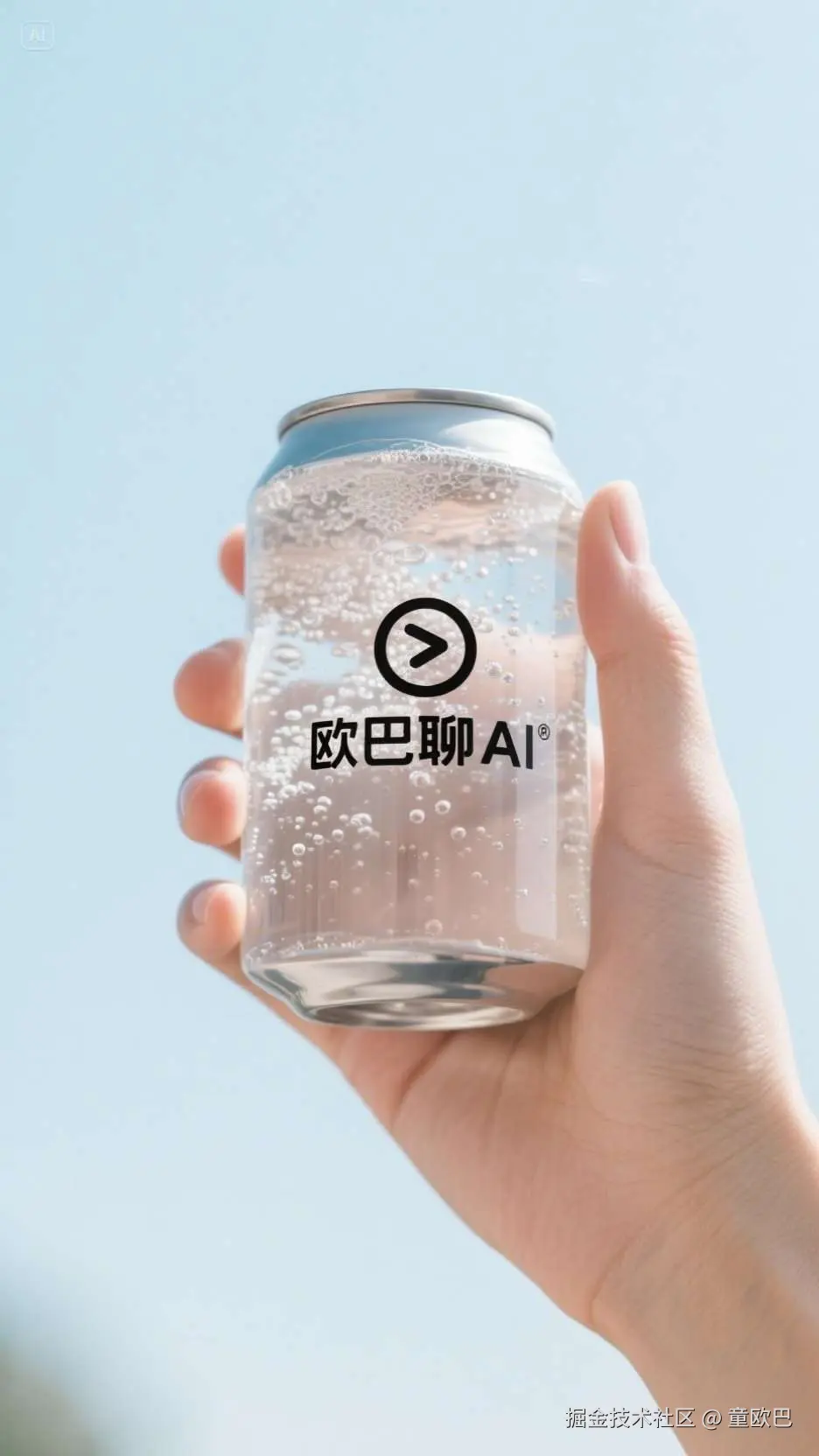 提示词:特写镜头,单手拿着一罐苏打水,罐体是透明玻璃,能看到里面的气泡,罐体中间包装上写着"欧巴聊AI"品牌名字,背景是淡蓝色的天空,极简主义美学