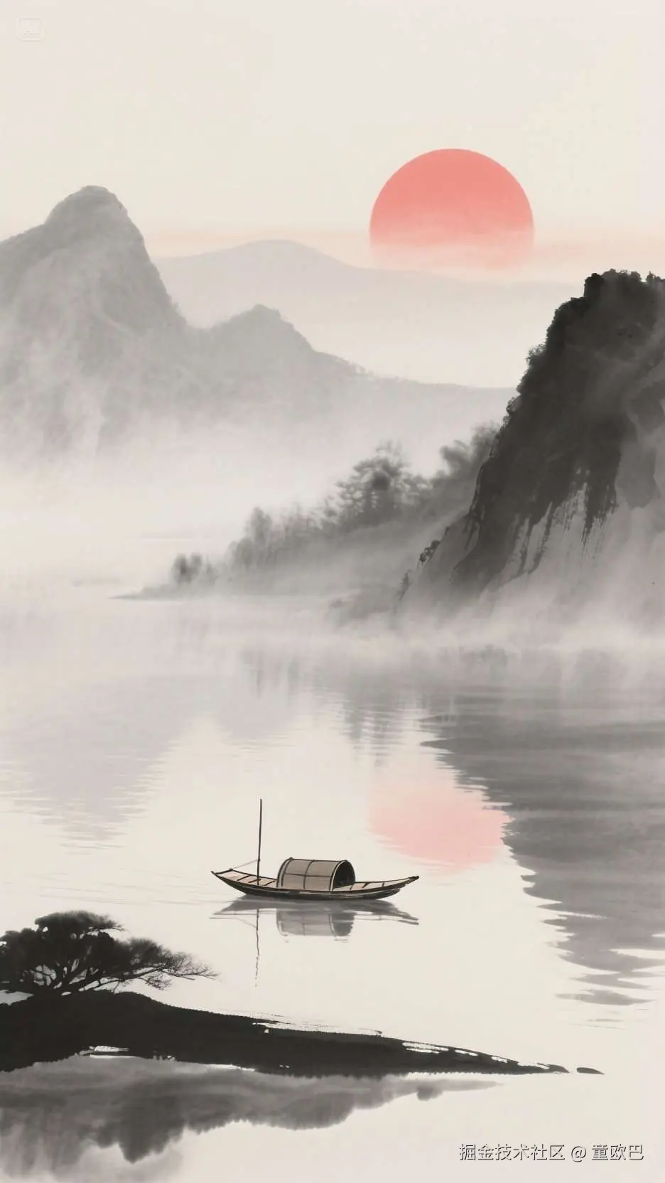 提示词:水墨风格,淡雅色调调和,朦胧晕染氛围,自然过渡,柔和,红日,山水倒映,一片孤舟远行,大写意,极简主义