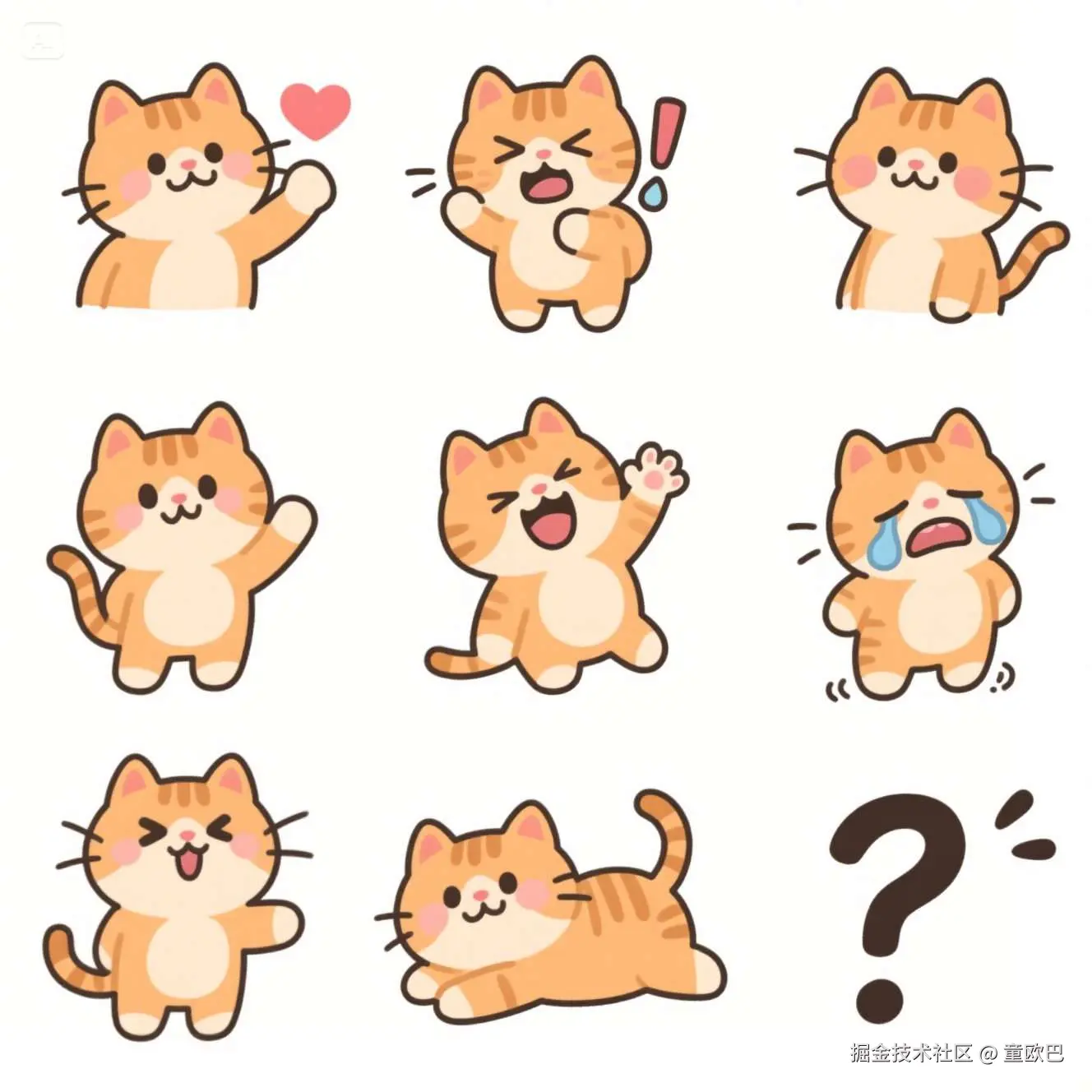 提示词:九宫格表情包设计。一只可爱的动漫柯基正在做九种不同的表情动作,分别是:可爱比心,生气,充满活力,打招呼,躺平,大笑,尴尬,哭泣,疑问。风格:纯白色背景,不要出现分割线,整体画风治愈温暖