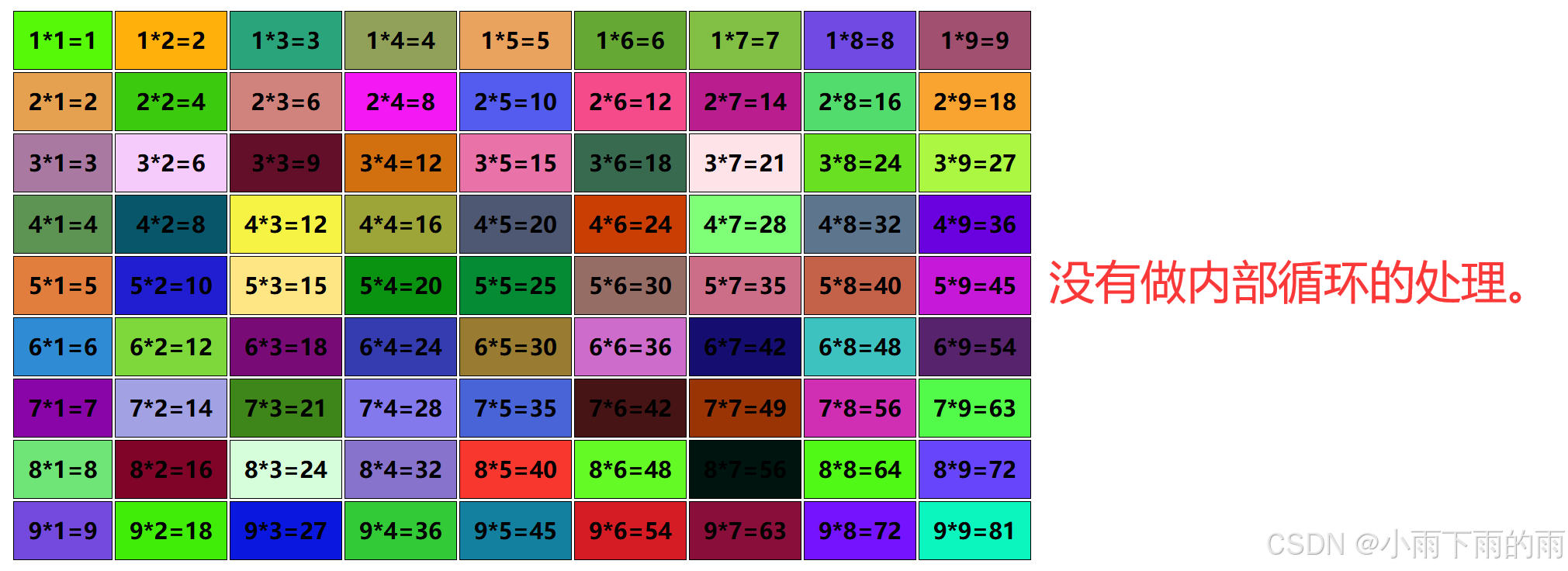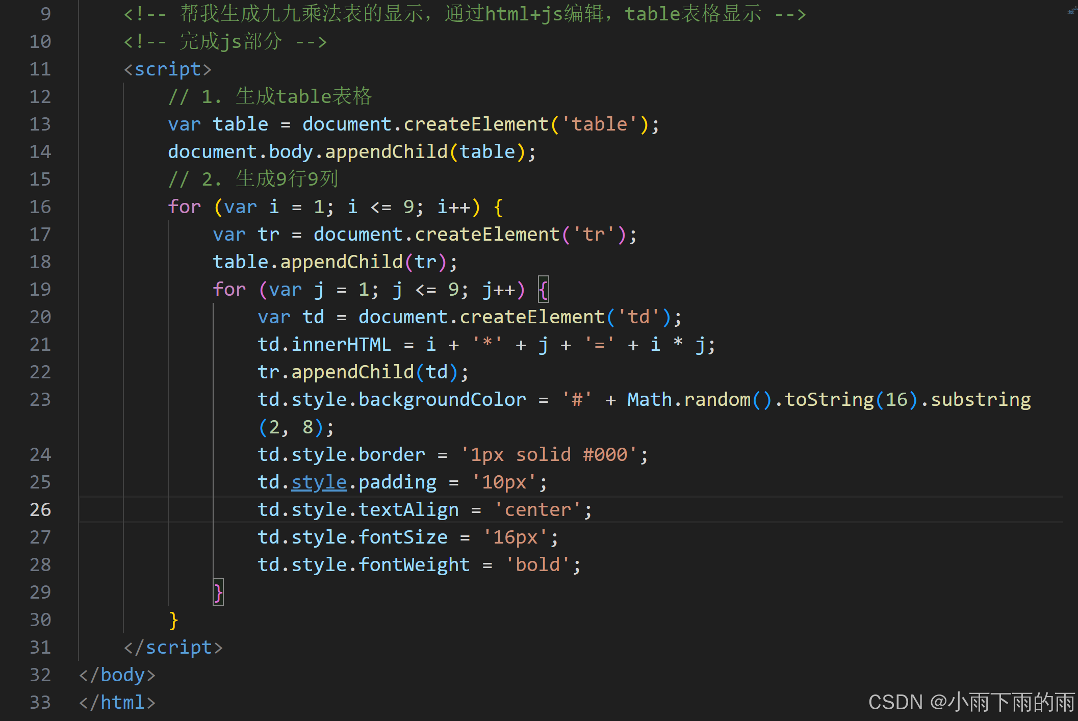 <!-- 帮我生成九九乘法表的显示,通过html+js编辑,table表格显示 -->