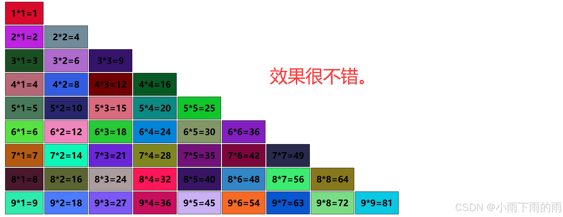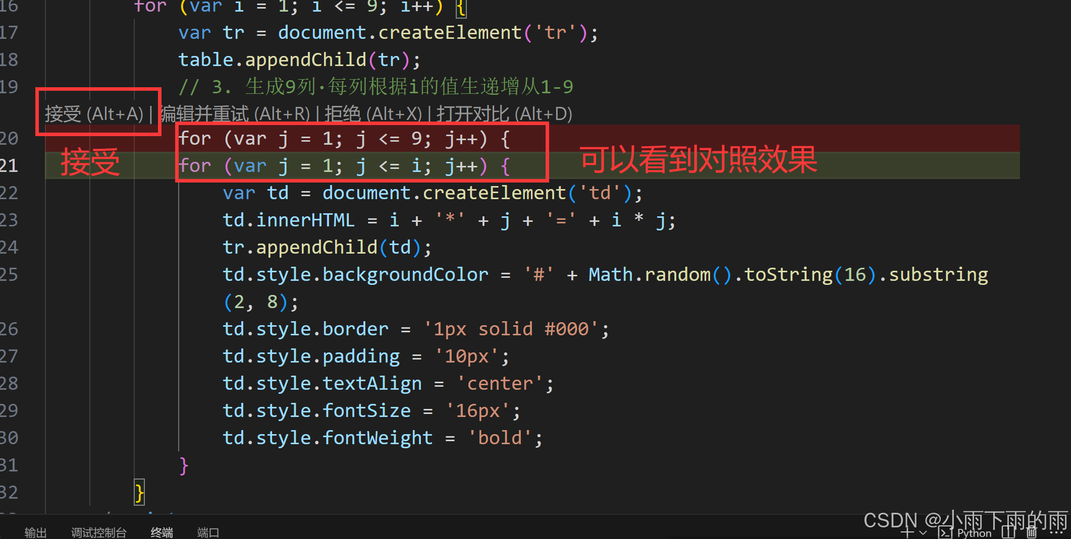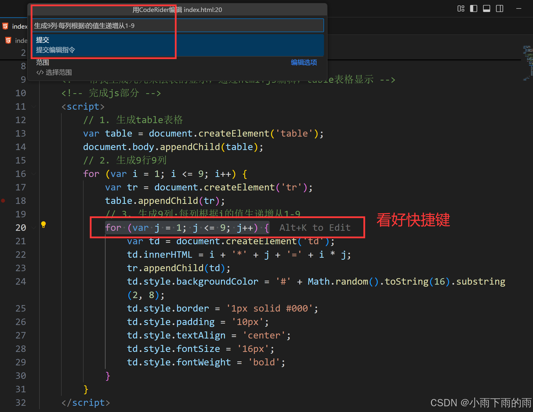 可以在效果中看到,将j<=9更换成了j<=i这样就可以完成九九乘法表的效果了,接受的快捷键也是组合键,使用的是Alt+A。