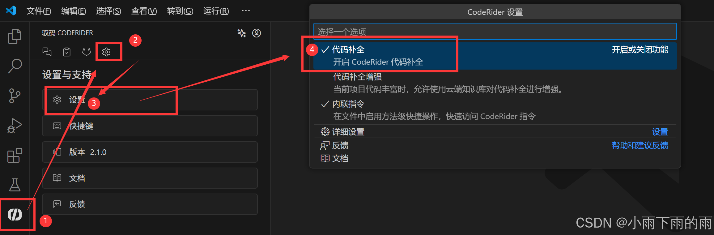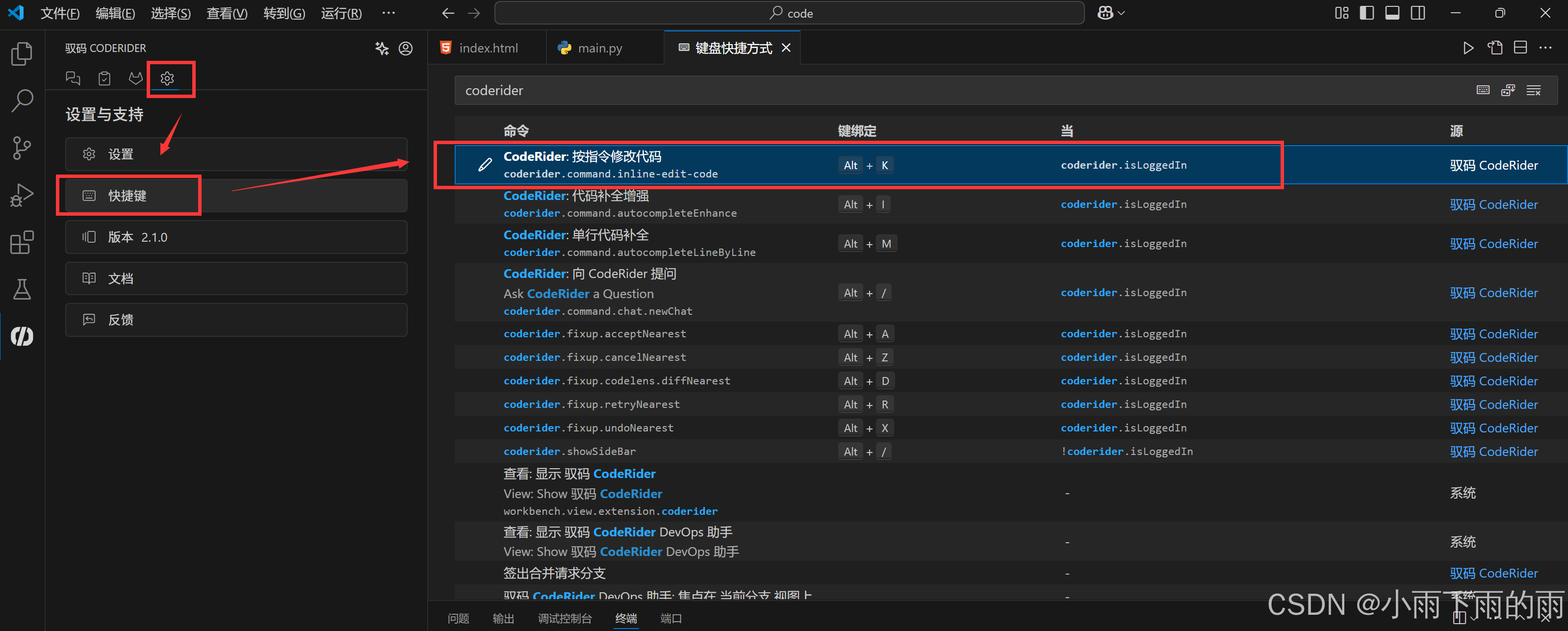 我们在真正开发中会用到很多的自由逻辑,那么在自有逻辑上就很难通过一次性提问来获取我们想要的结果,我们就可以通过驭码的这个神技来完成我们的业务逻辑功能,今天我就主要演示一下这个代码补全的功能。代码智能实时补全:跨文件实时生成单行或多行代码推荐,支持灵活选择代码补全的模型引擎。我们可以通过快捷键设置的方式将当前的操作方式改成自己熟悉的方式。驭码 CodeRider - AI 编程与软件智能研发助手 -