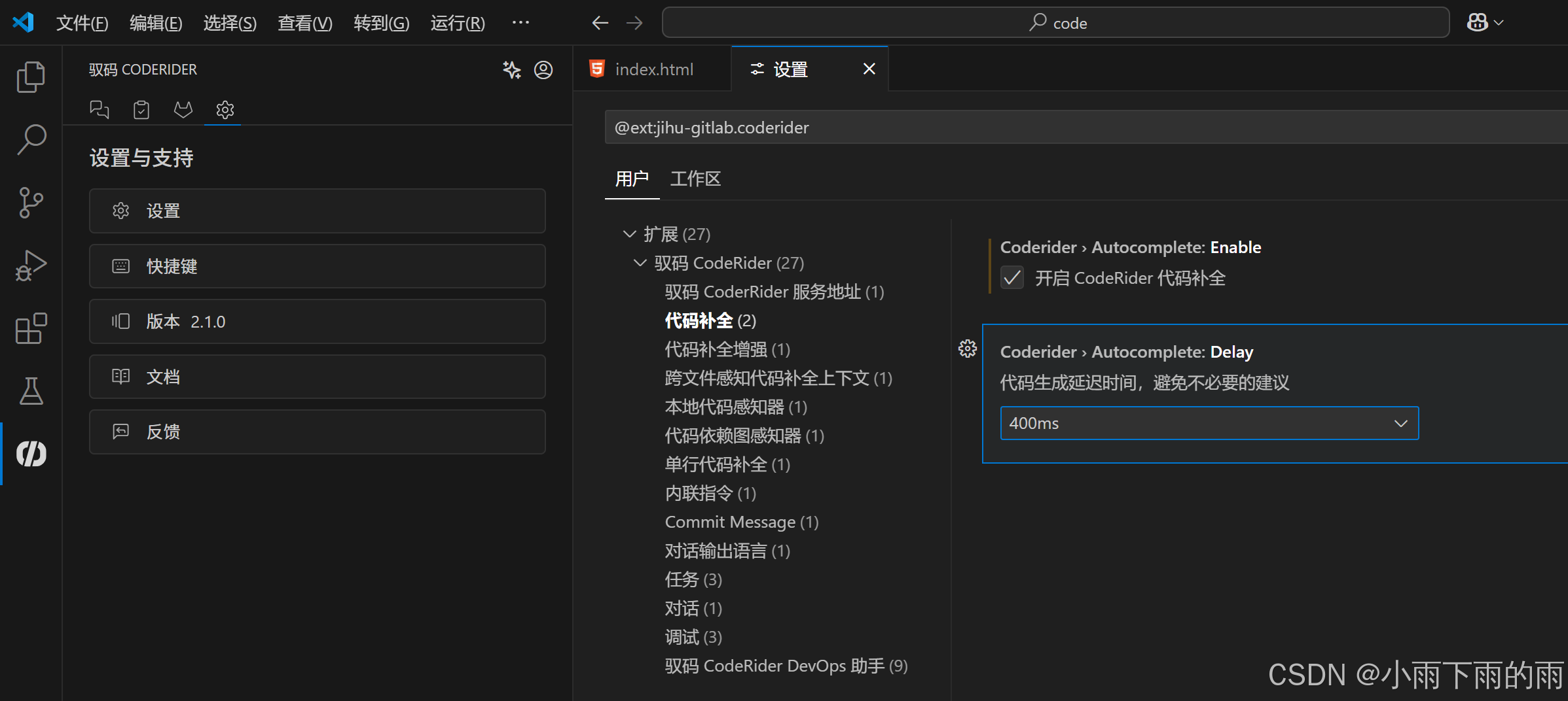 我们点击【详细设置】既可以看到对应的代码补全的两个选项,第一个是开启,第二个是代码生成延时时间,可以看到这里是400ms,代表我们时间操作的时候是需要稍微等待一下才会出现对应的提示内容的。