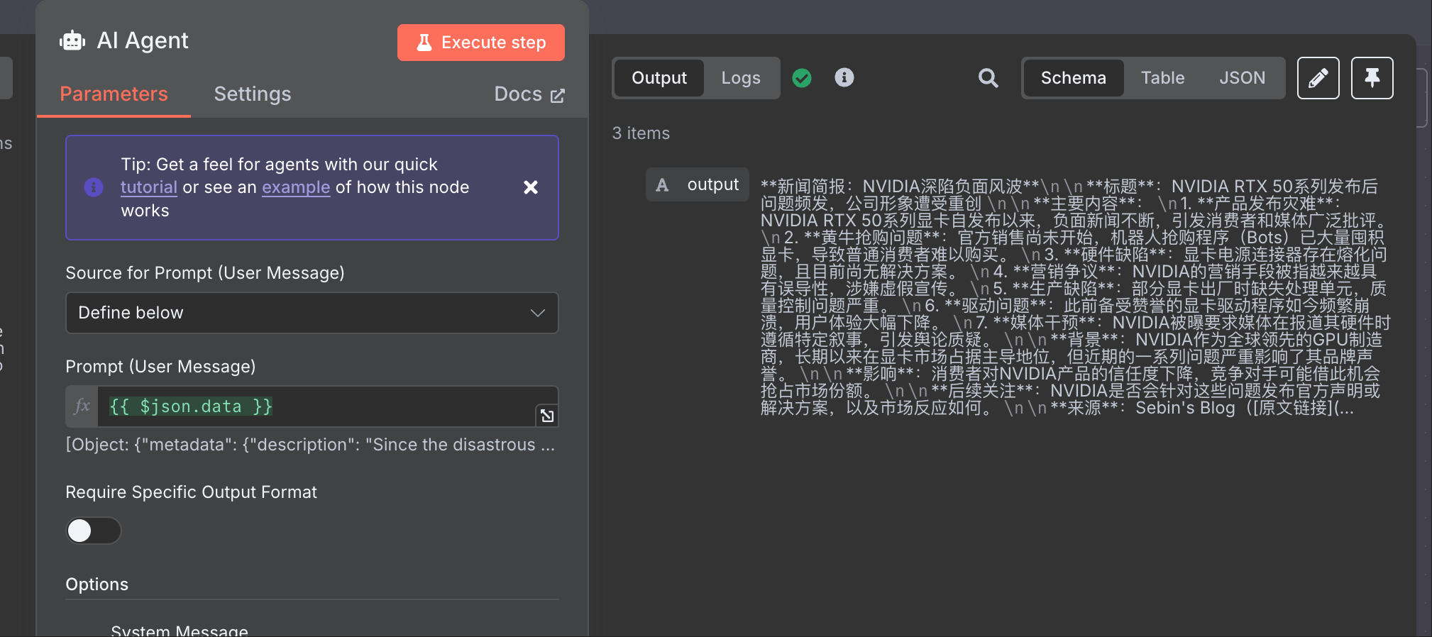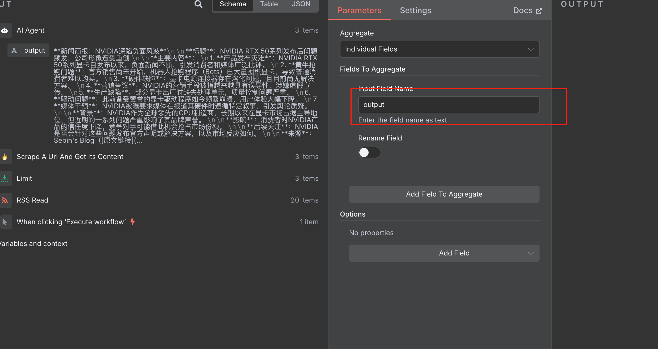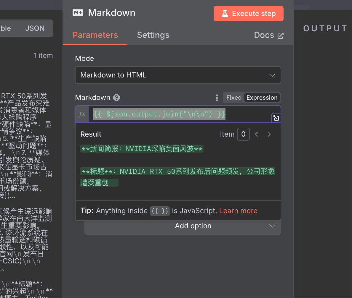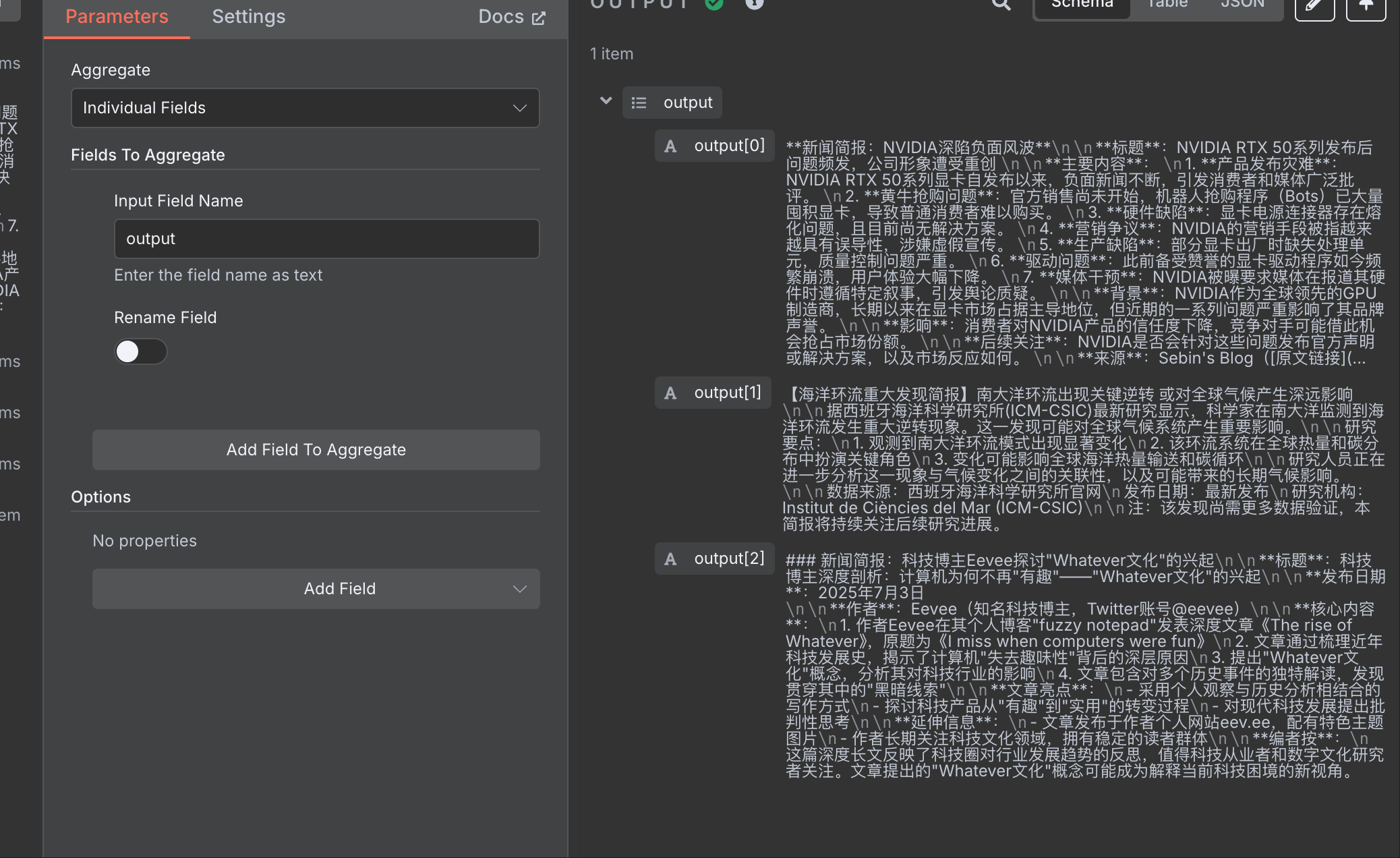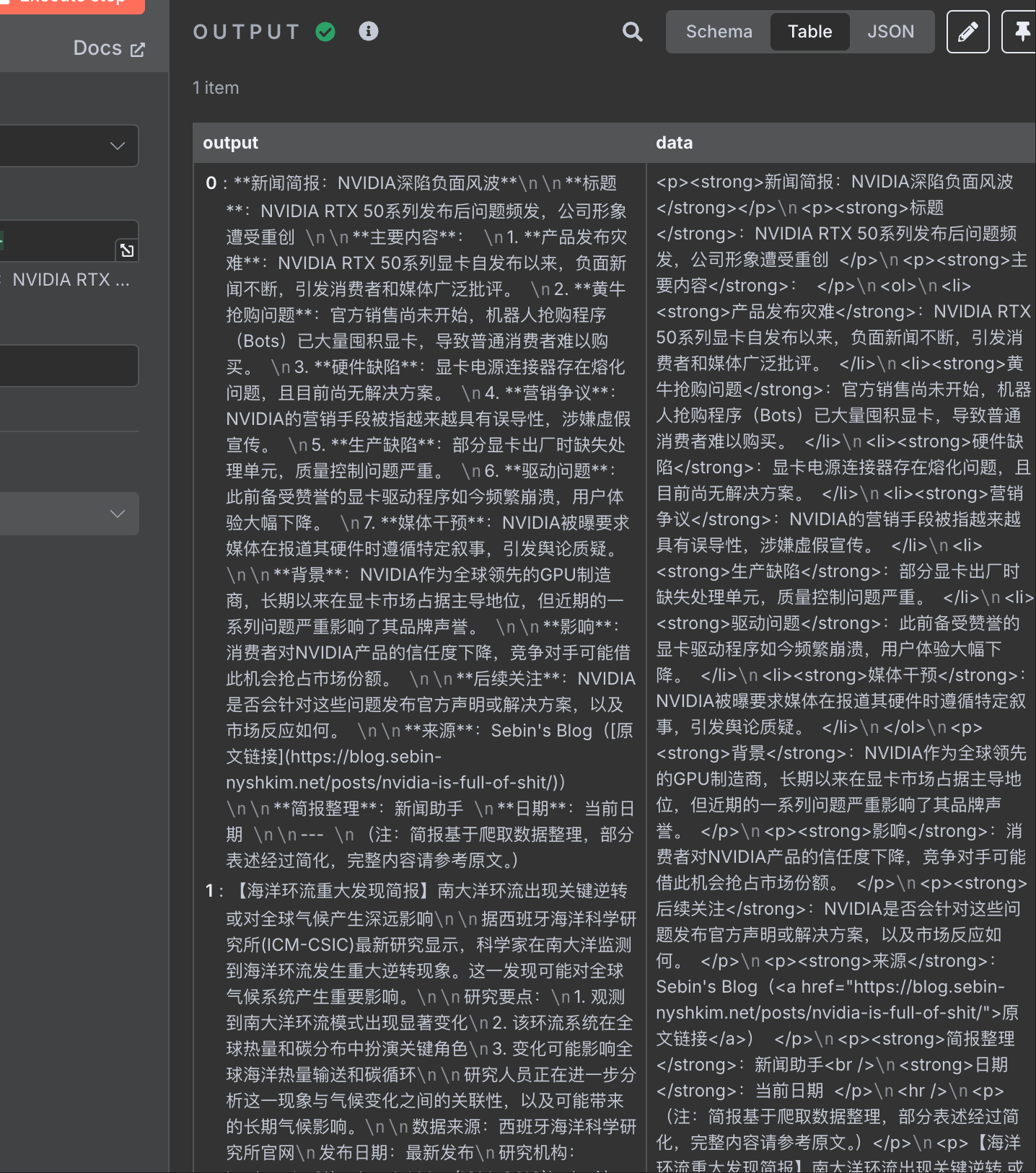 由于我们是一个list,因此我们需要补充换行符 {{ $json.output.join("\n\n") }}