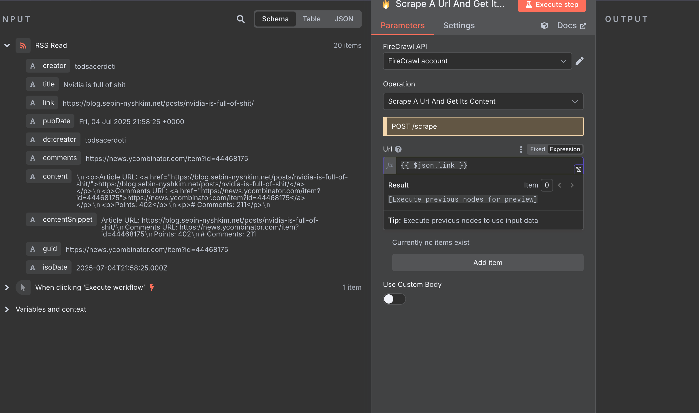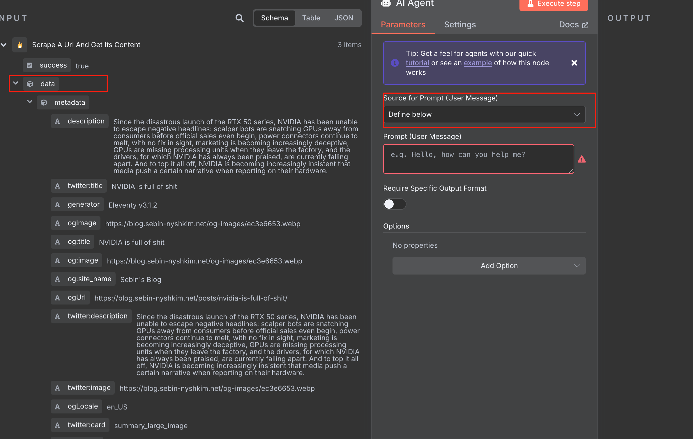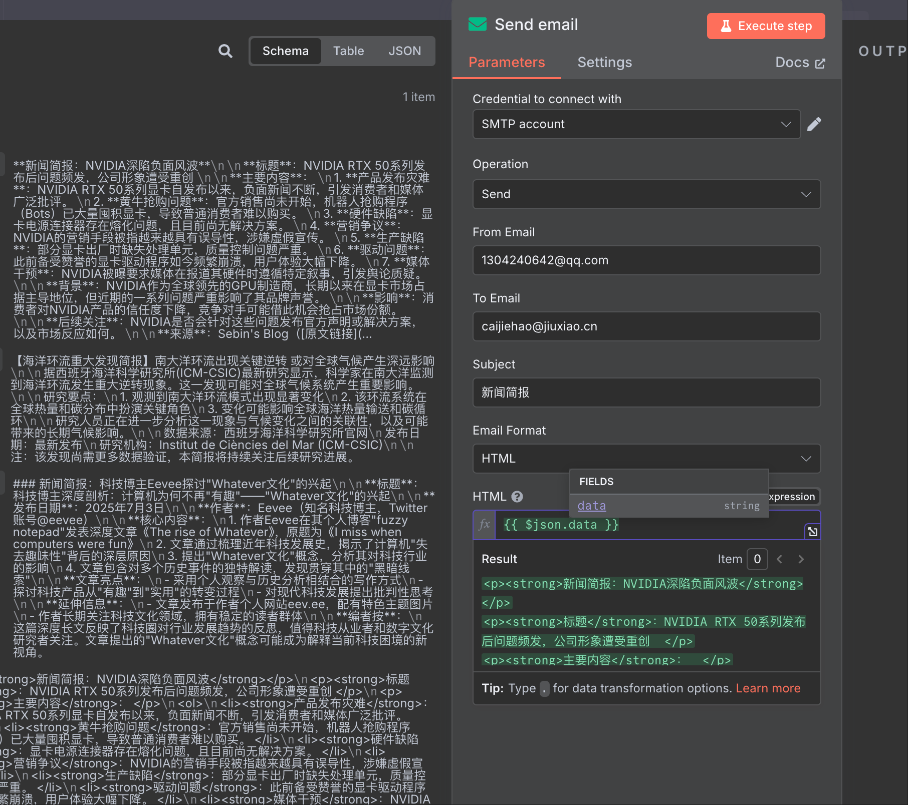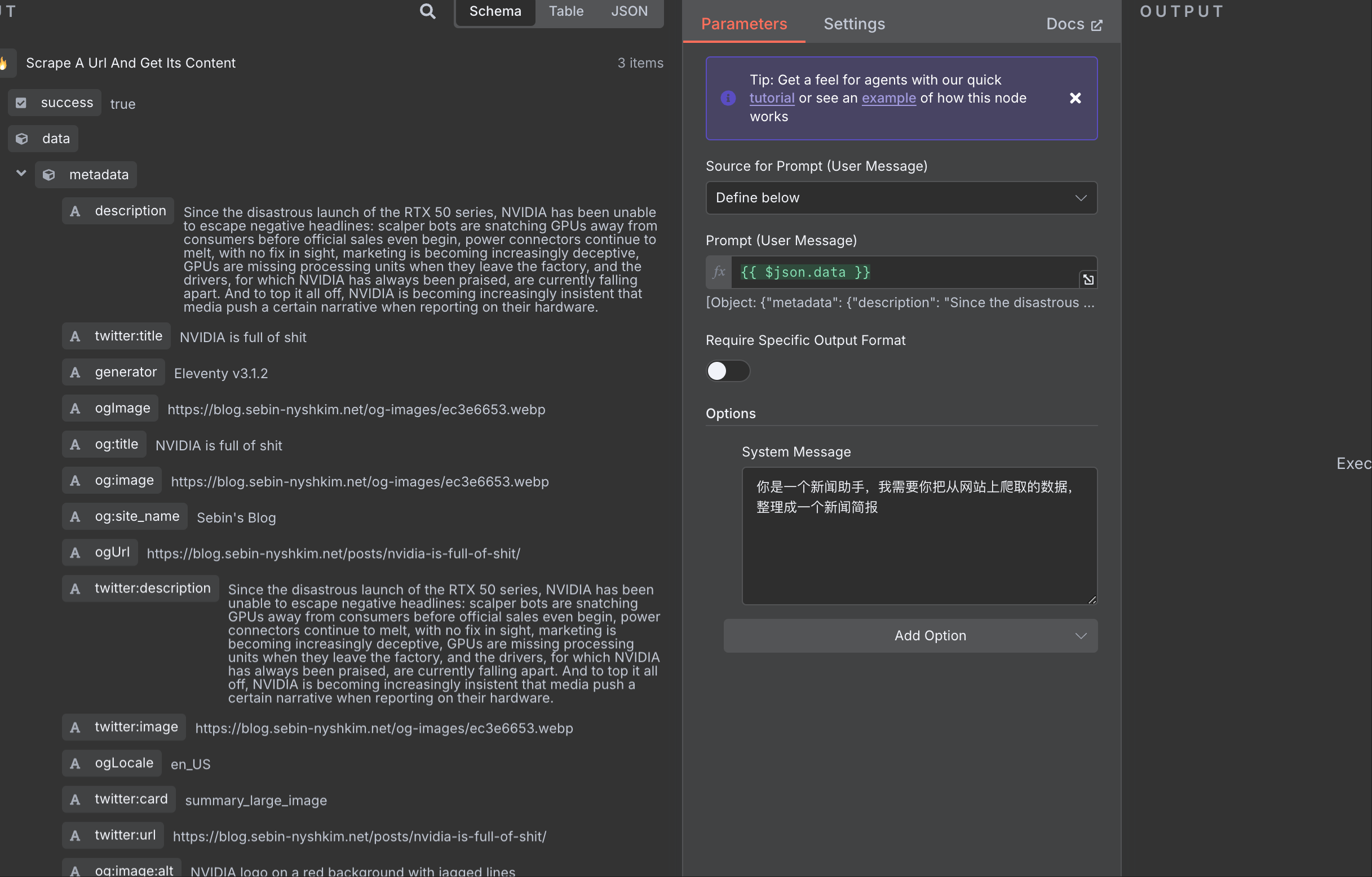 由于我们是一个list,因此我们需要补充换行符 {{ $json.output.join("\n\n") }}