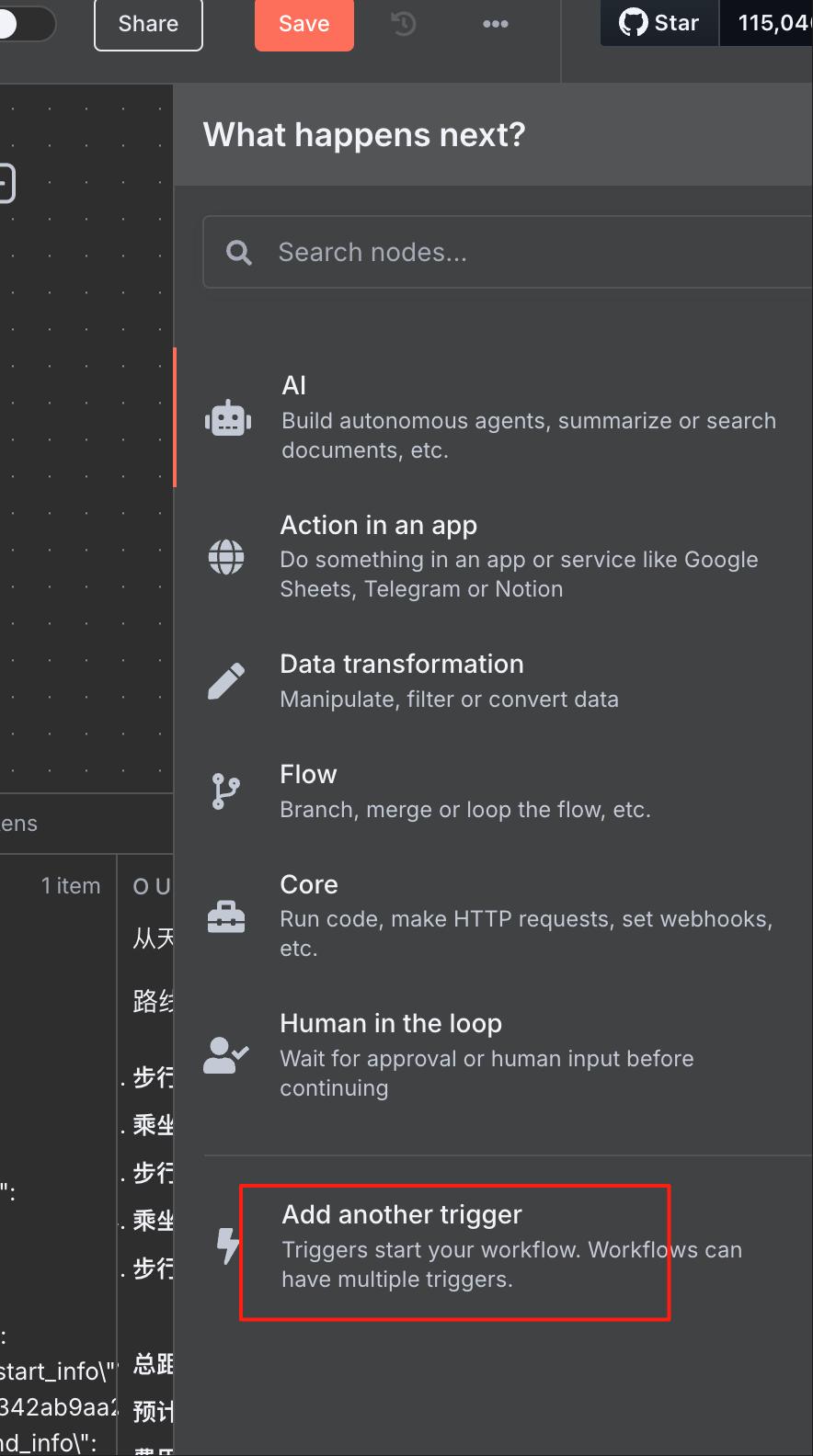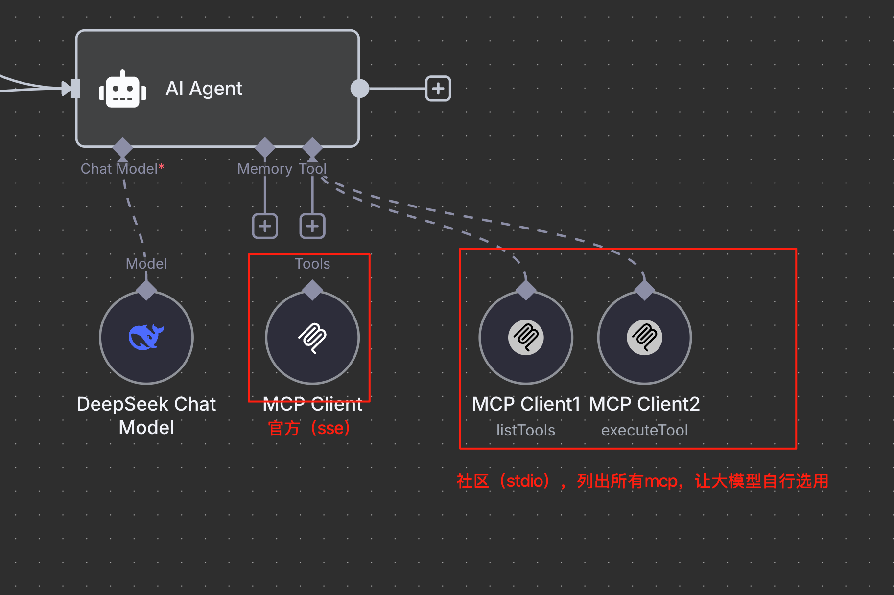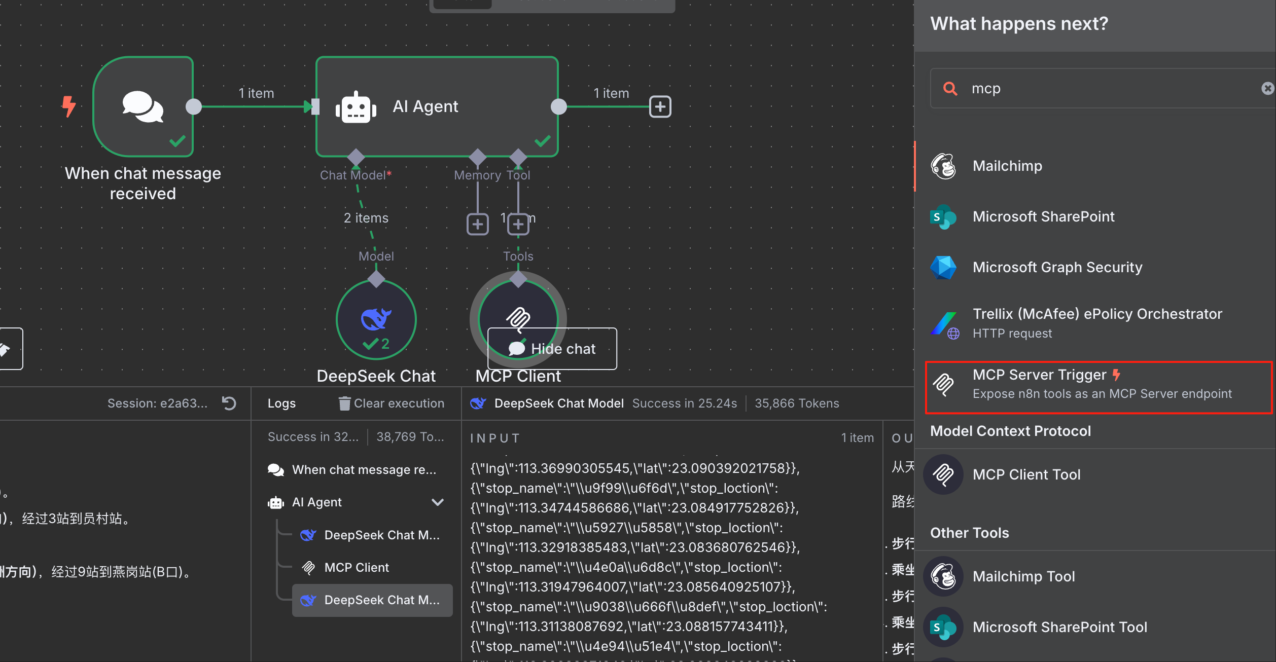 n8n在这里作为了mcp server给Cherry Studio 提供了地图服务同时又作为了mcp client使用了百度地图的mcp服务这种就是双向mcp的能力sse链接中有两个,一个是测试的url,测试的url使用一次之后,就会自动停止监听,生产的url可以不断的监听使用。