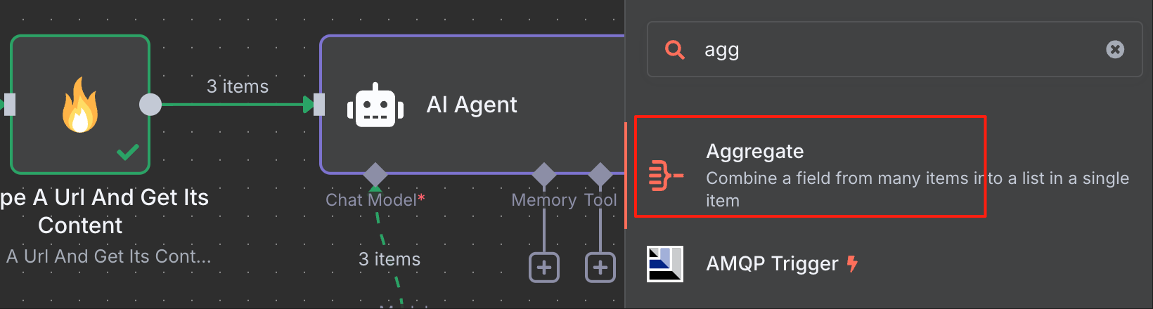 这里我想要将数据合并成为一个list,我们继续添加一个节点Aggregate
