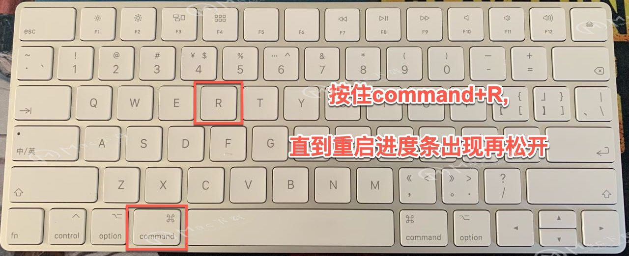 1、关机,然后重新启动你的Mac电脑,在开机时一直按住Command+R,直到进度条出现再松开,机器迸入Recovery模式。