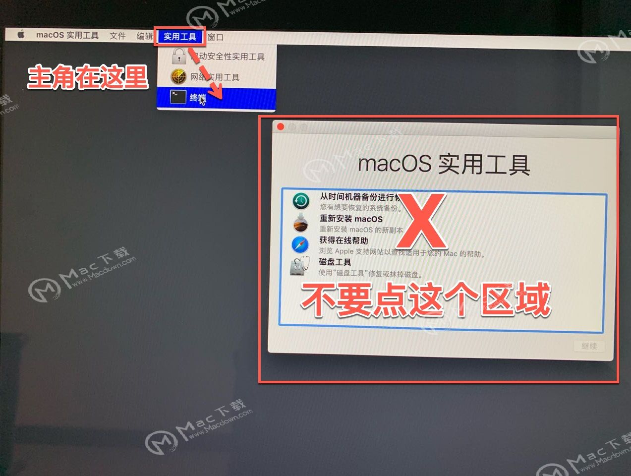然后在左上角实用工具中打开终端,不要理会图中小编标注的区域
