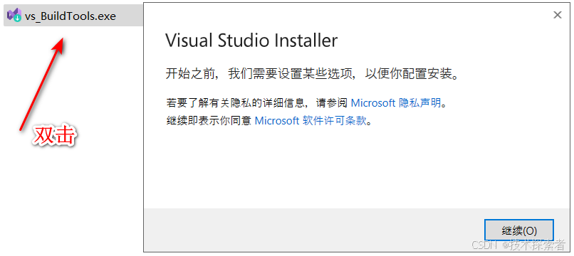 运行安装包,如下图所示,点击继续按钮,进入安装界面之后,选择使用C++的桌面开发,然后点击右下角的安装,直至安装完成即可。